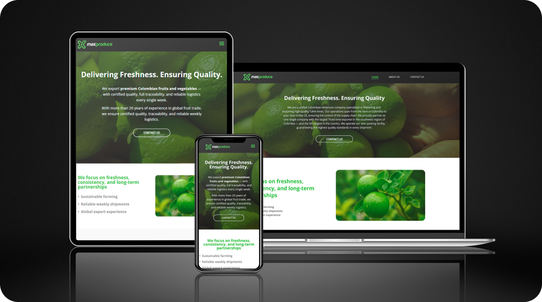 Sitio web para Max Produce, empresa dedicada a la distribución de limones frescos. Un diseño limpio y responsive enfocado en resaltar la calidad del producto y facilitar el contacto comercial.